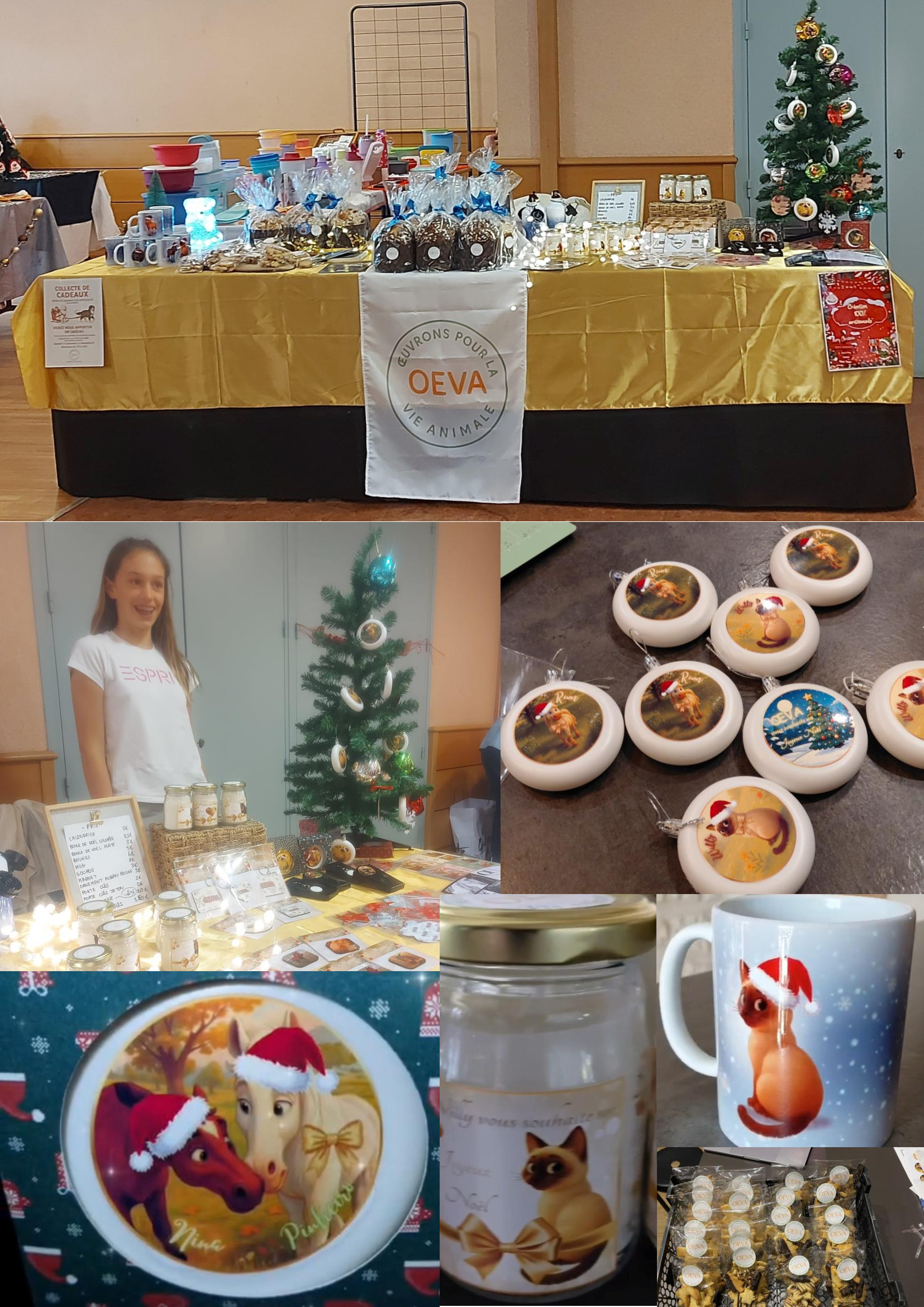 De nombreux produits y étaient proposés, similaires à ceux du marché de Noël de l’EHPAD : objets et créations personnalisés à l’effigie des animaux d’ŒVA, boules de Noël, bougies, Mugs, porte-clés, sablés et autres articles faits avec soin.