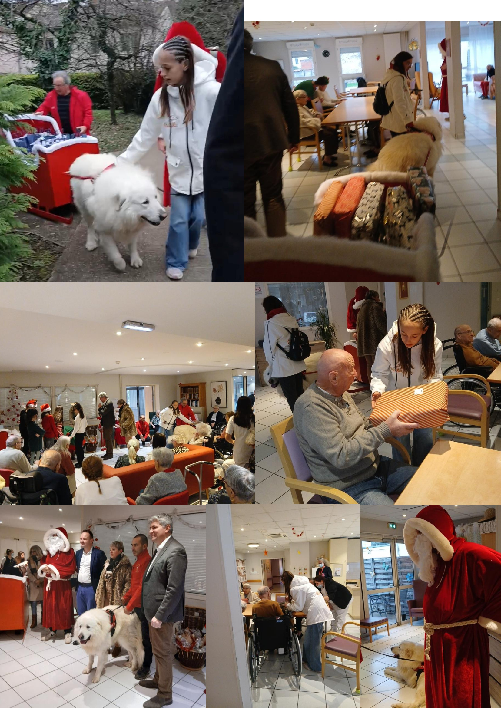 Pour l’occasion, Titan, notre chien montagne des Pyrénées, a joué un rôle central en transportant les cadeaux avant leur distribution auprès des résidents.