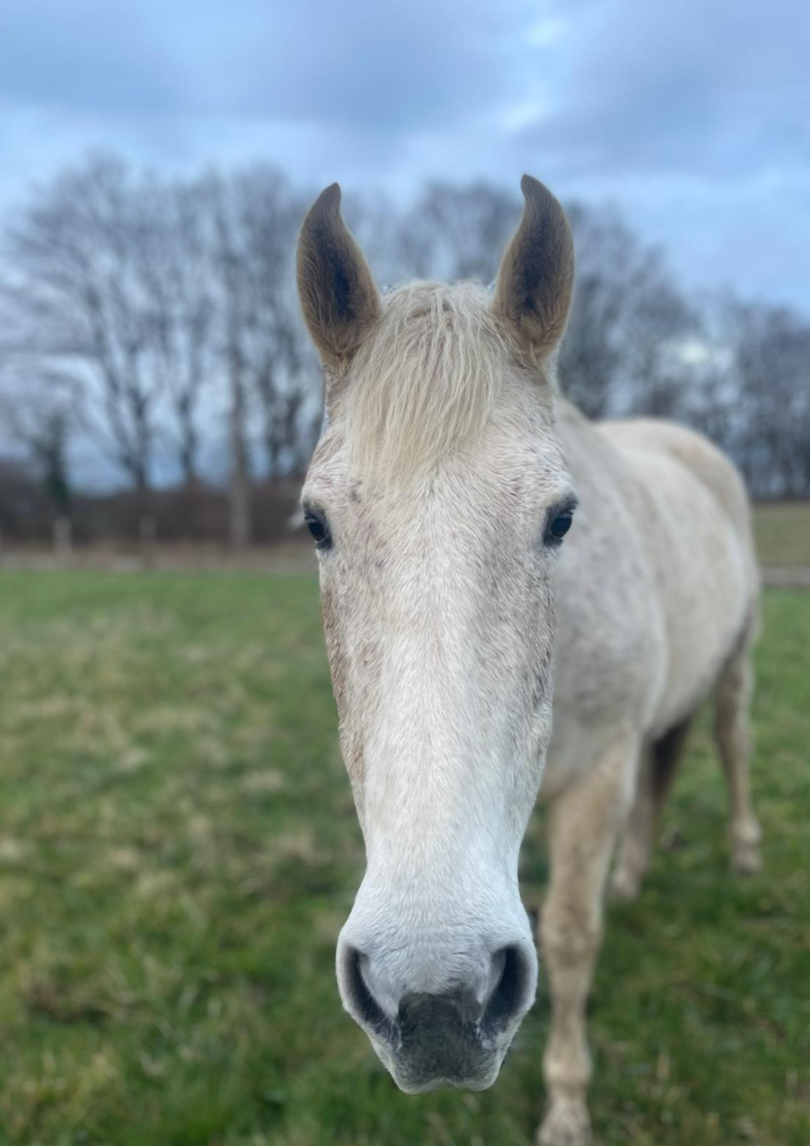 Arrivée le 05 Mars 2026 au sein de l’association ŒVA, Rezada est une jument d’environ vingt ans au regard doux et à la robe blanche tachetée.